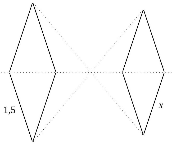 Voici un losange et son image par une homothétie de rapport \(-0{,}9\). Calculez la longueur \(x\). Unité : m.