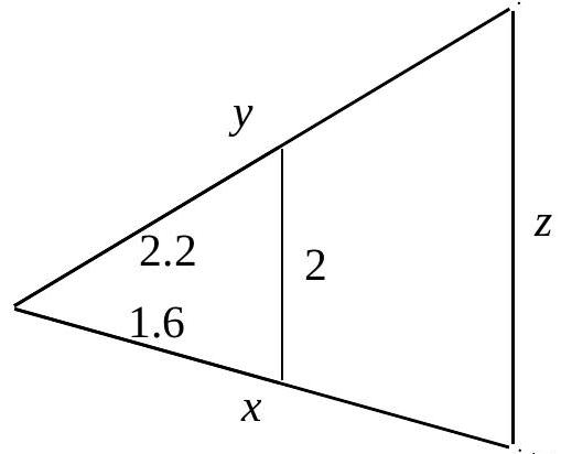 Voici un triangle et son image par une homothétie de rapport 1,85. Calculer les longueurs \(x\), \(y\) et \(z\).