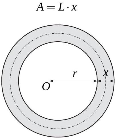 Un terrain circulaire est entouré d’un chemin de largeur \(x\) et d’une aire \(A\). On désigne par \(L\) la longueur du cercle pointillé situé au milieu du chemin. Montrez que