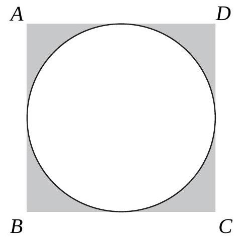 Calculer le périmètre du disque inscrit dans le carré \(ABCD\), sachant que l’aire de la surface ombrée est de \(123,84~\mathrm{cm}^{2}\). (On prendra l’approximation \(\pi \simeq 3,14\).)