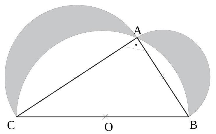 ABC est un triangle rectangle en \(A\). On a construit un demi-cercle sur chacun de ses côtés pris comme diamètre. On a ombré les croissants compris entre le grand demi-cercle et les deux autres. Calculer l’aire de la figure ombrée, sachant que